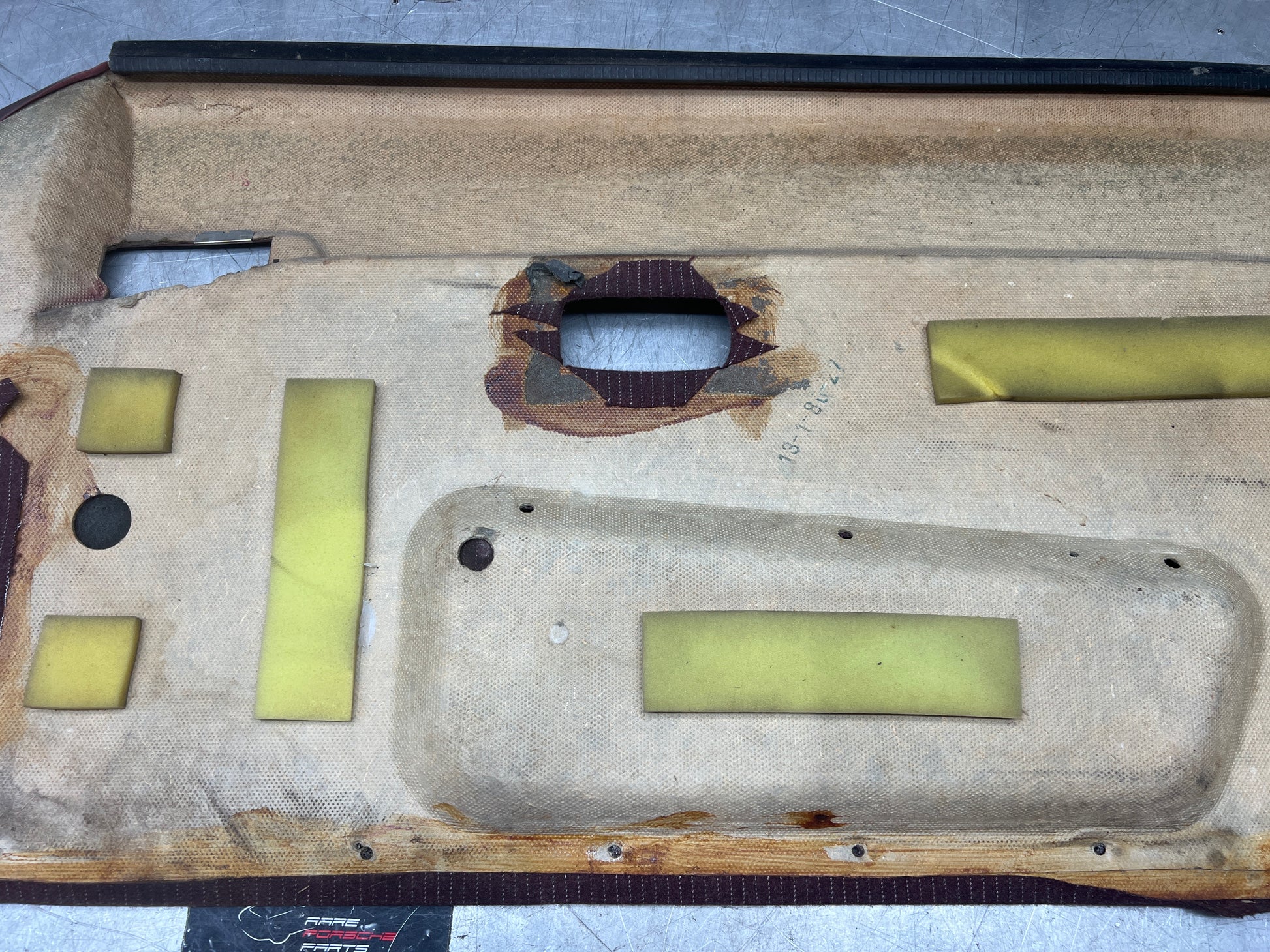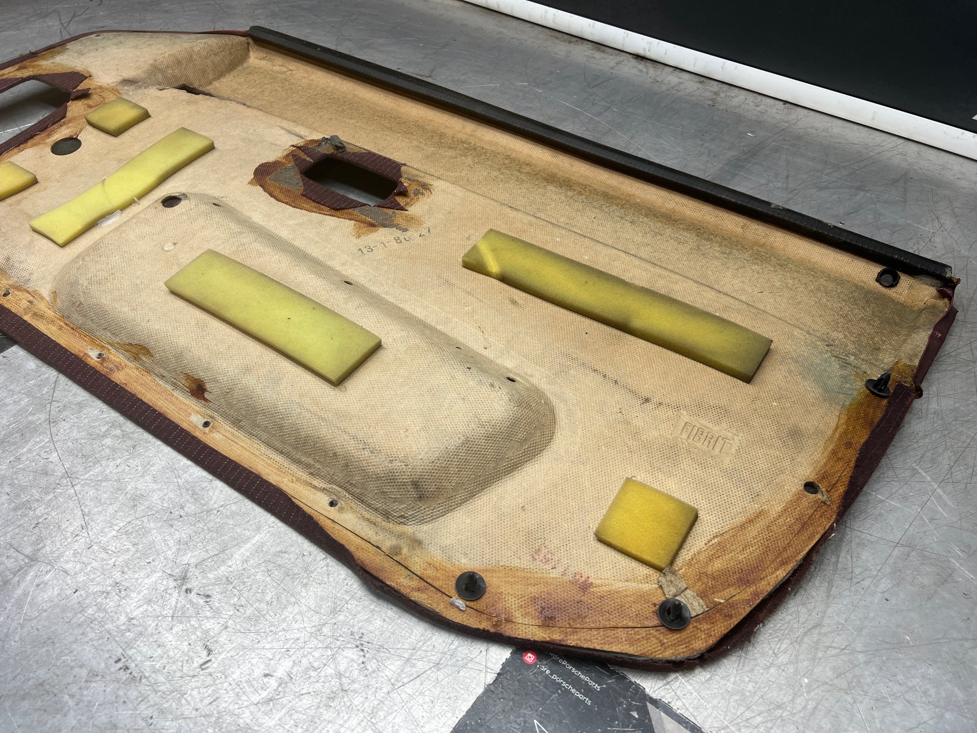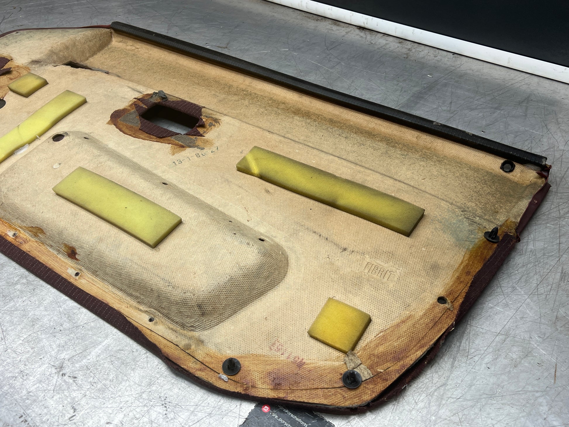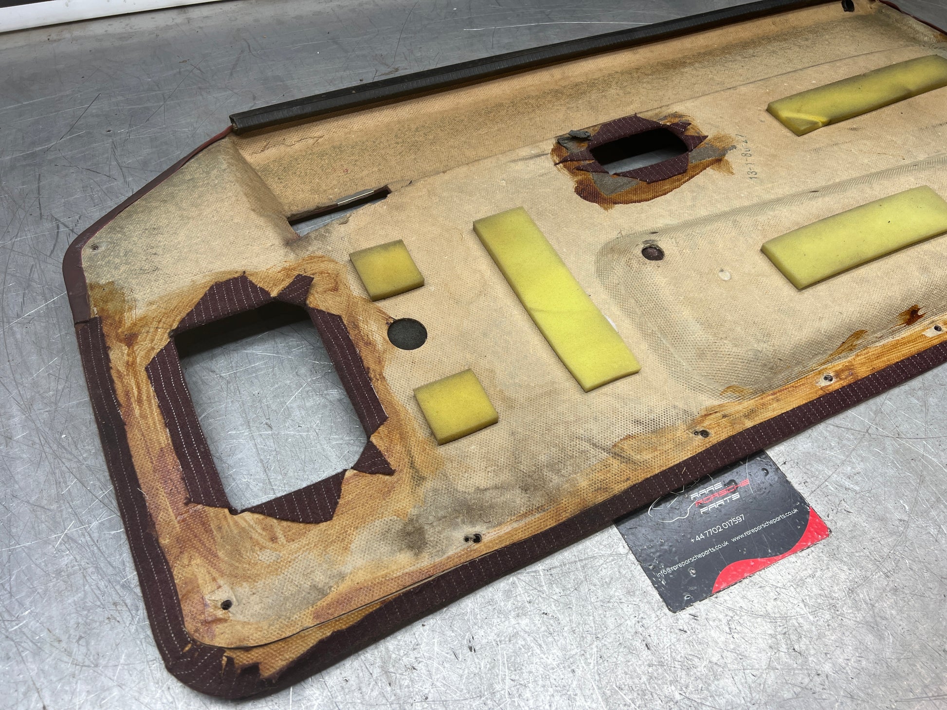 Porsche 944 left burgundy pinstripe door card for late cars from 85.5. Used condition, please study pictures for condition, a little bit bent due to previous incorrect storage but should come back to shape easily.