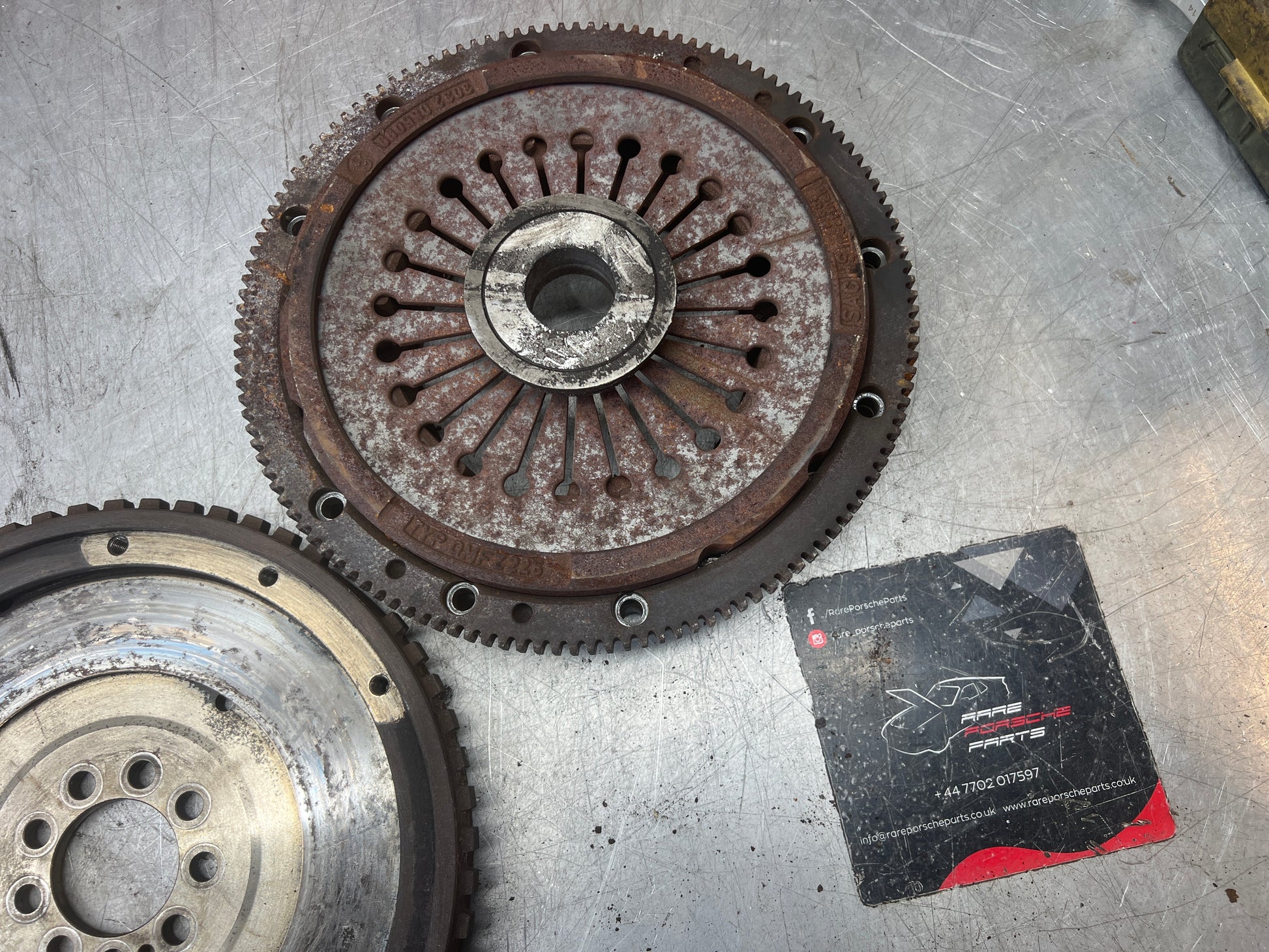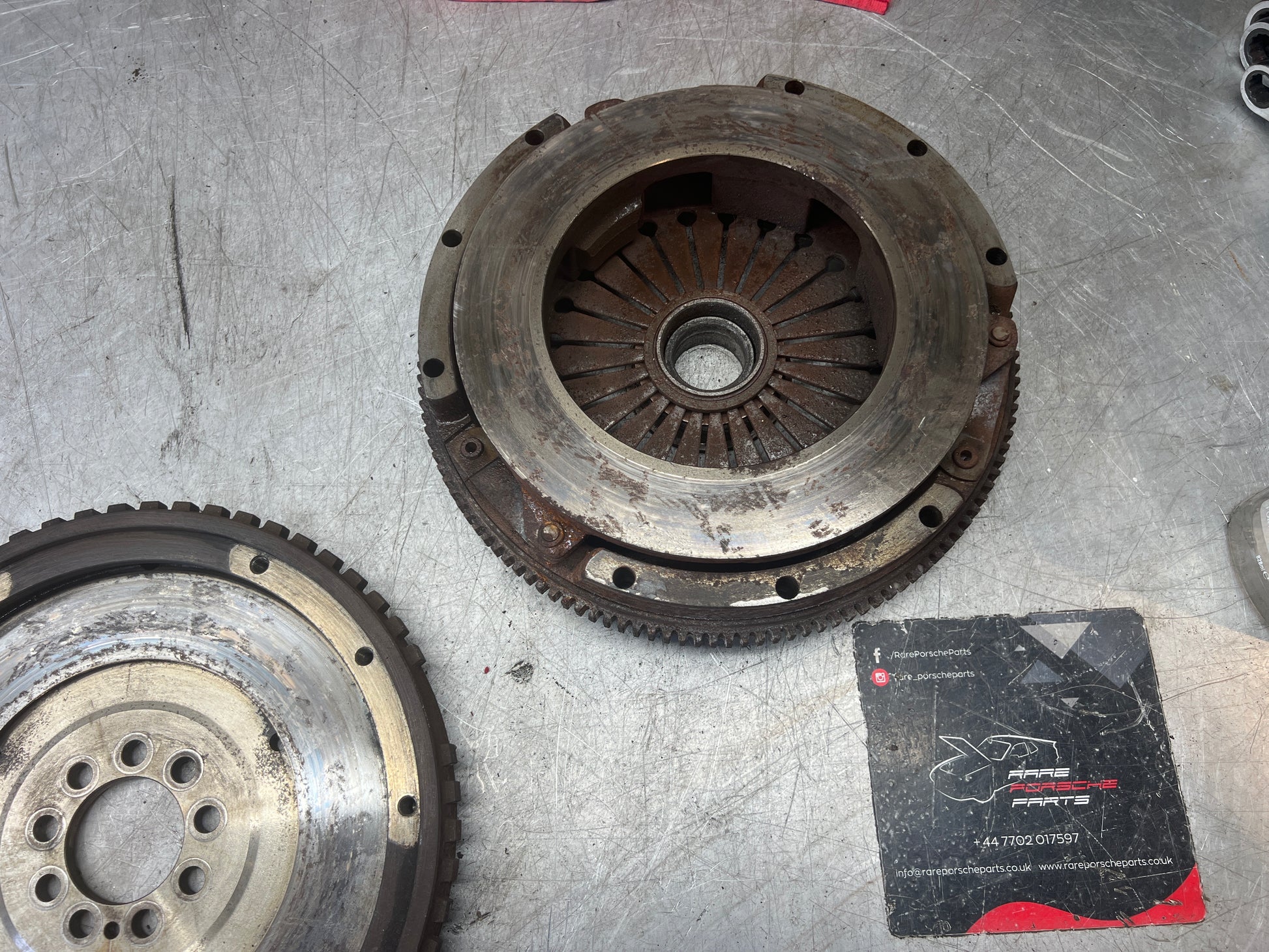 Flywheel and pressure plate as removed from a 944 S2, note there is no starter ring. These are available separately if required