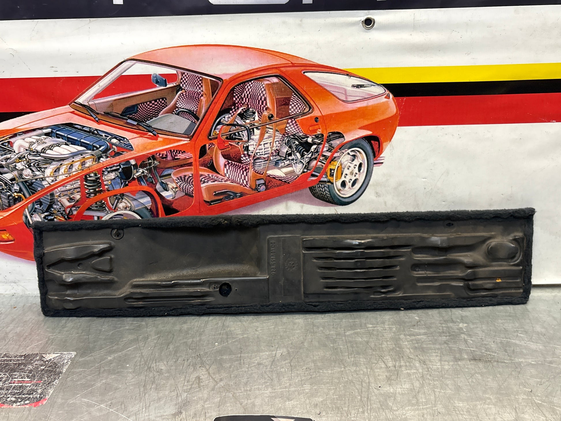 Porsche 928 black carpeted Tool kit panel cover, used 92855118106