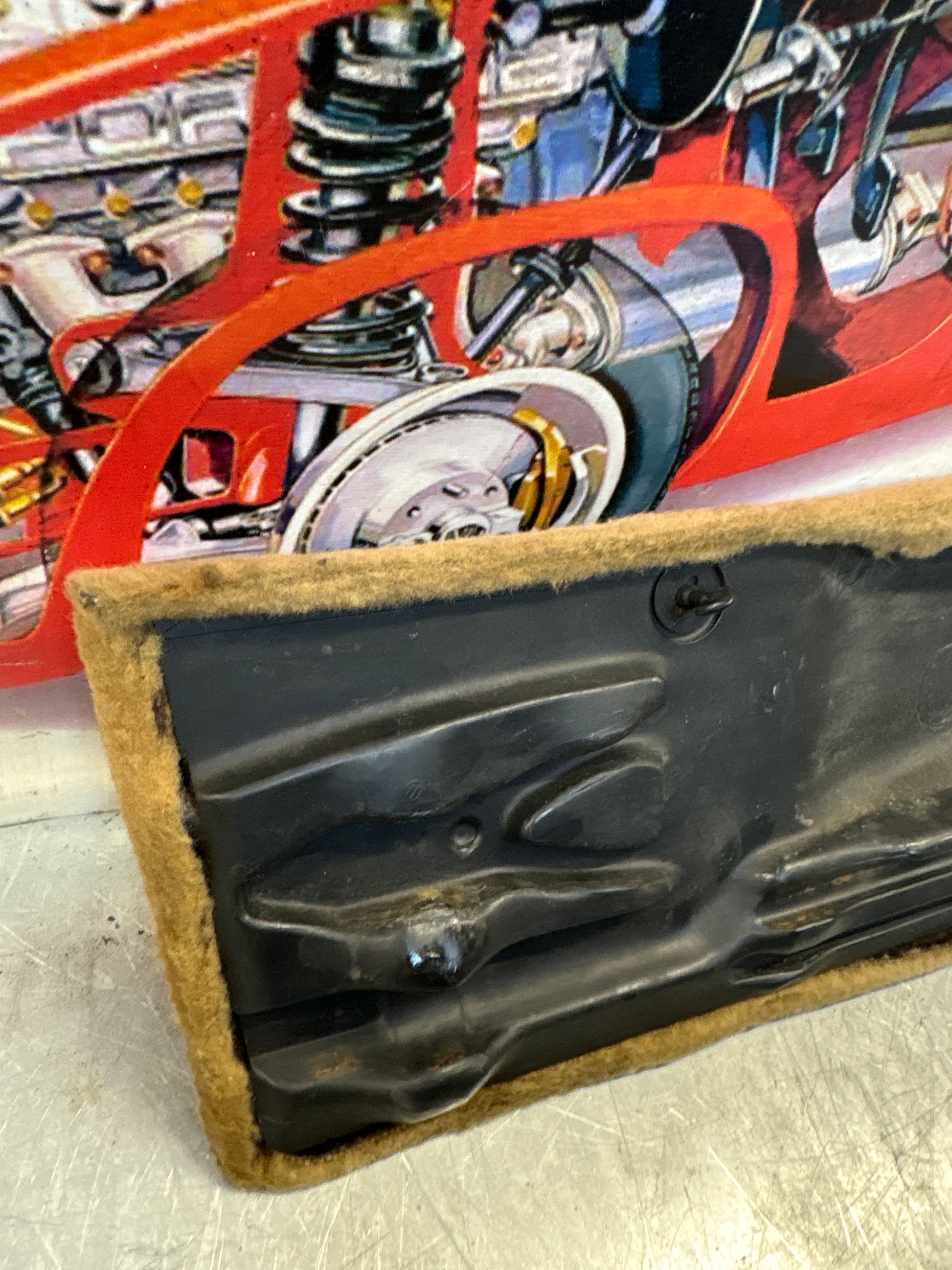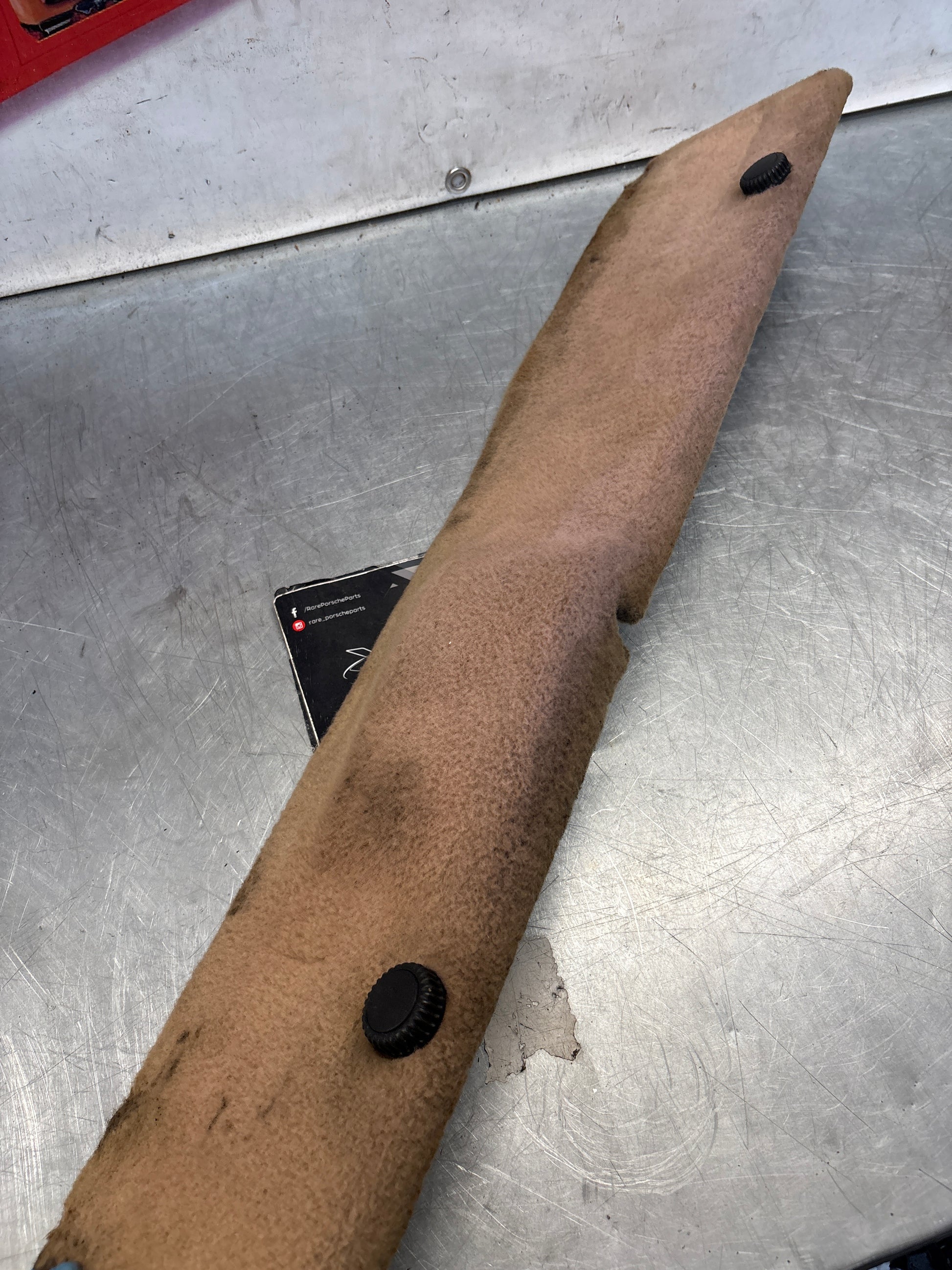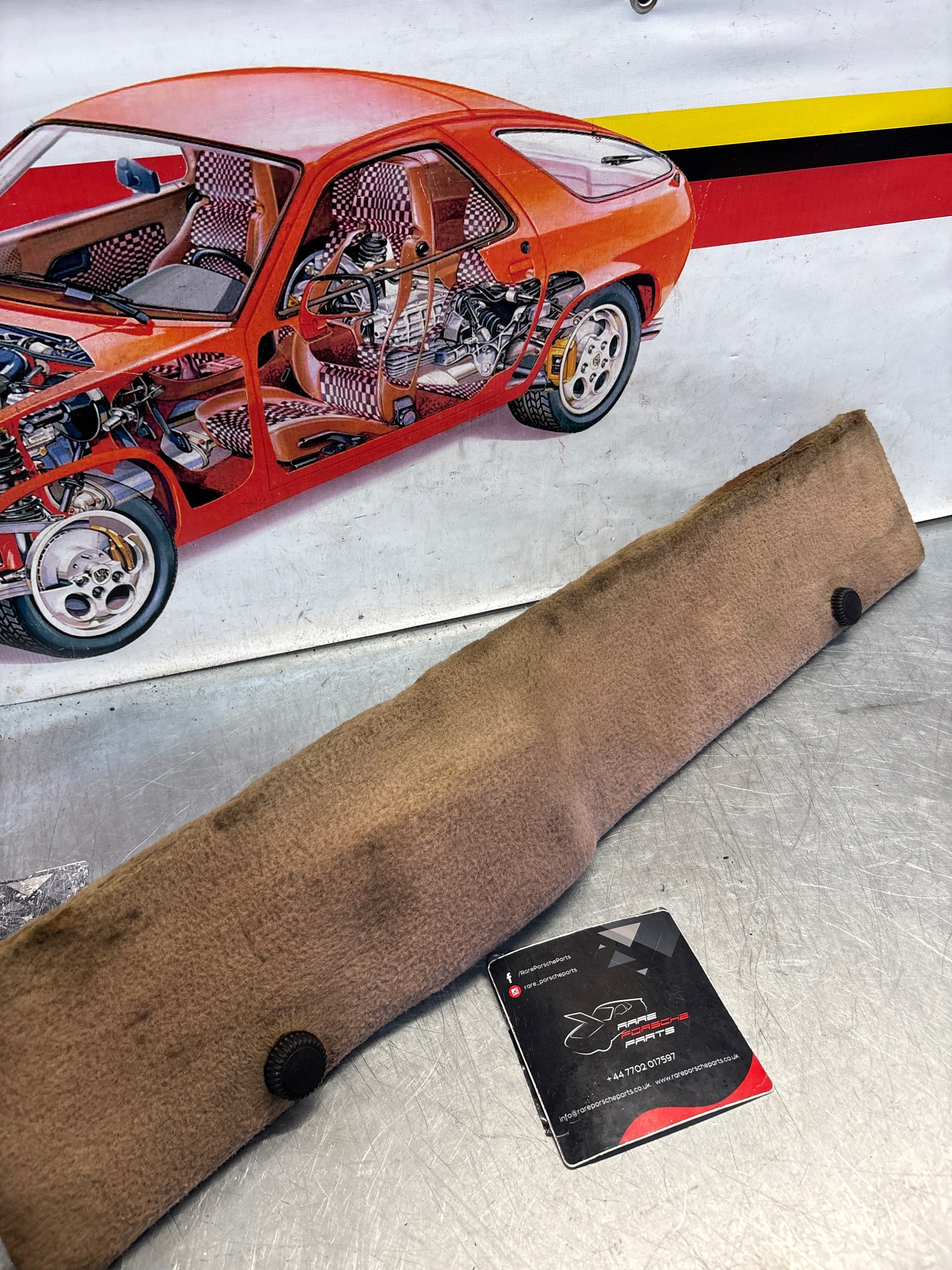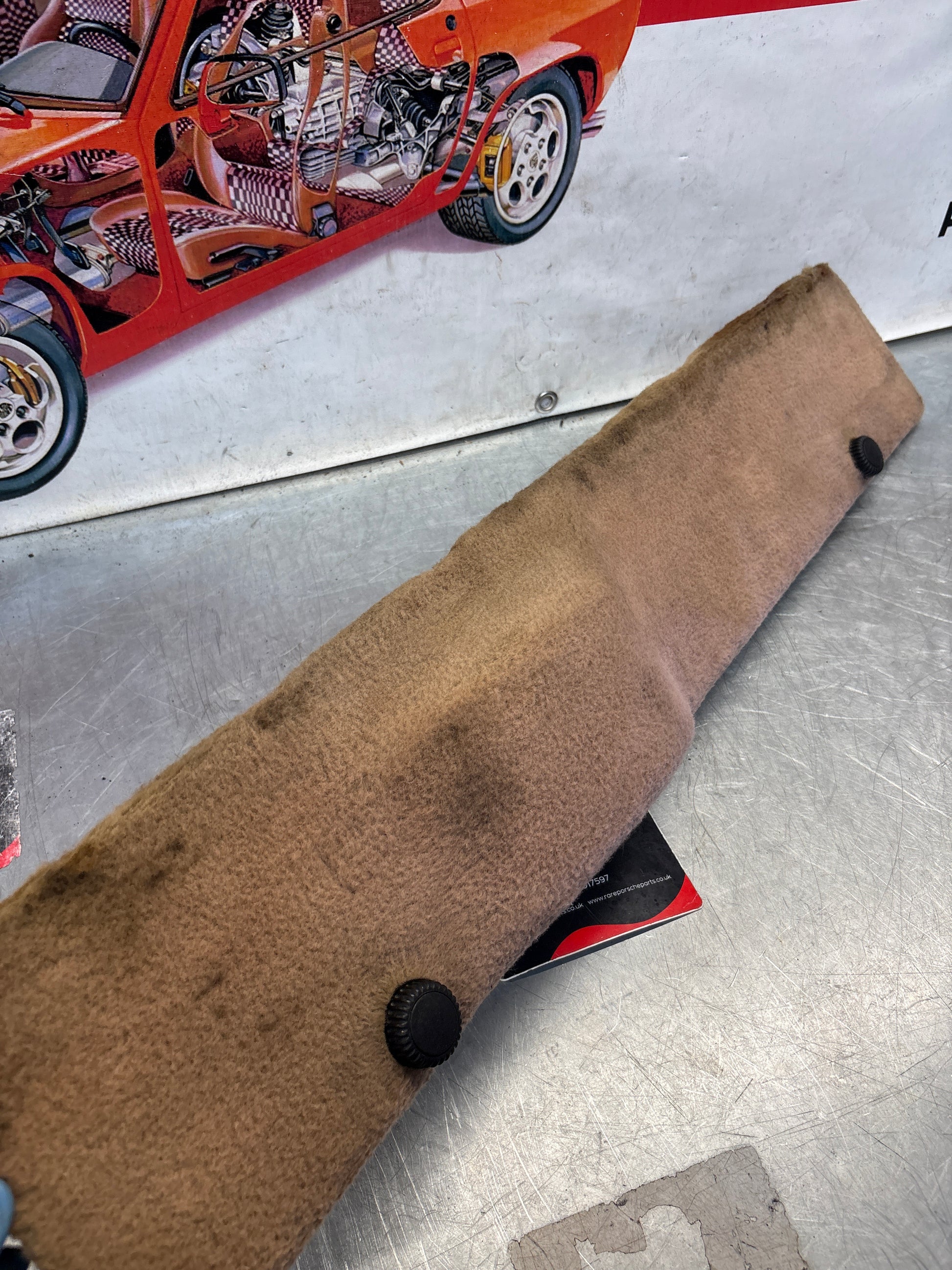Porsche 928 greyish-beige carpeted Tool kit panel cover, used 92855118105