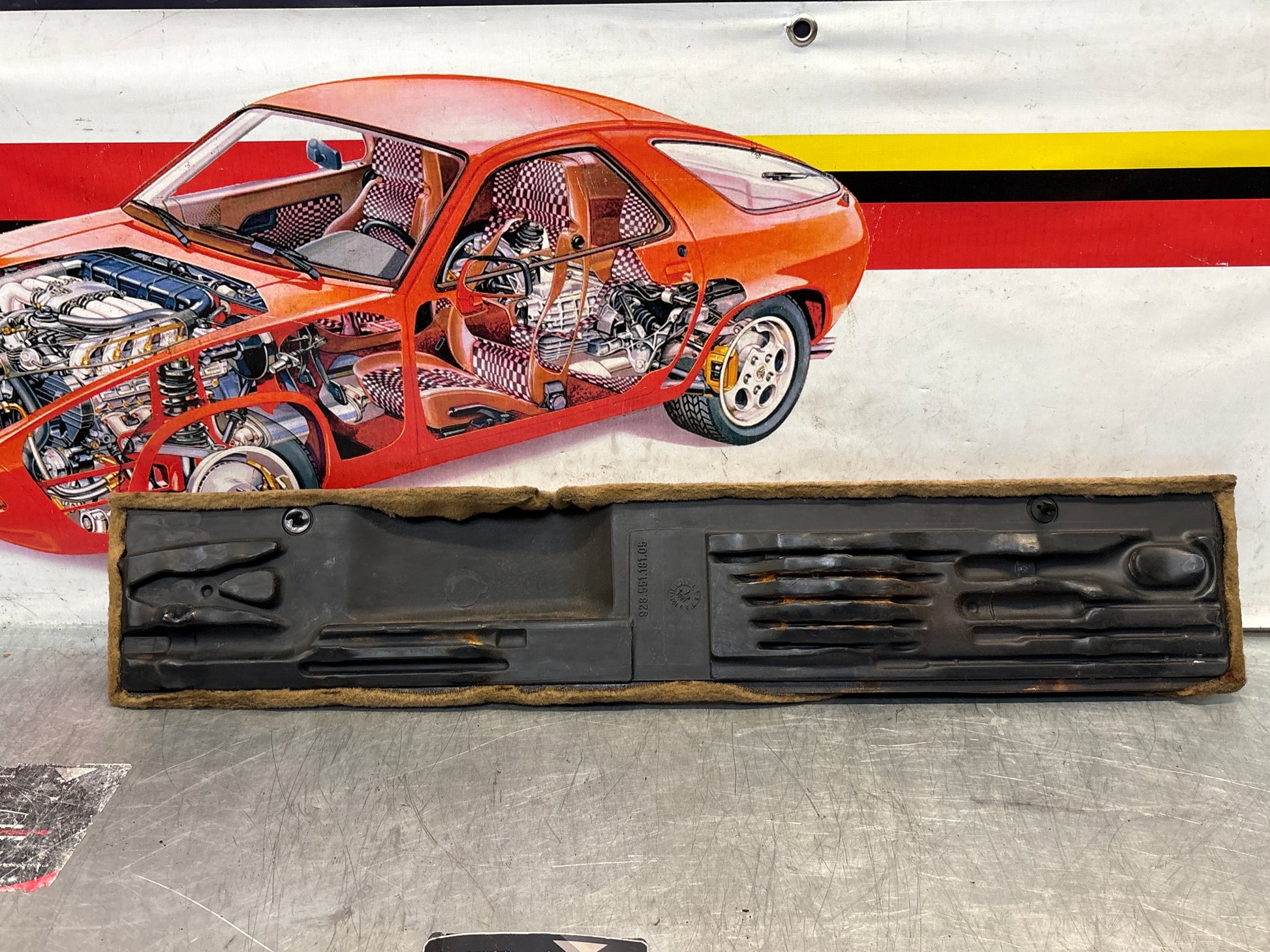 Porsche 928 greyish-beige carpeted Tool kit panel cover, used 92855118106