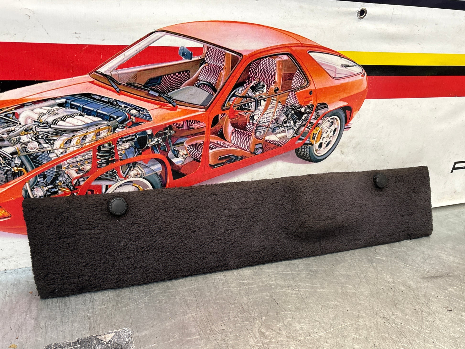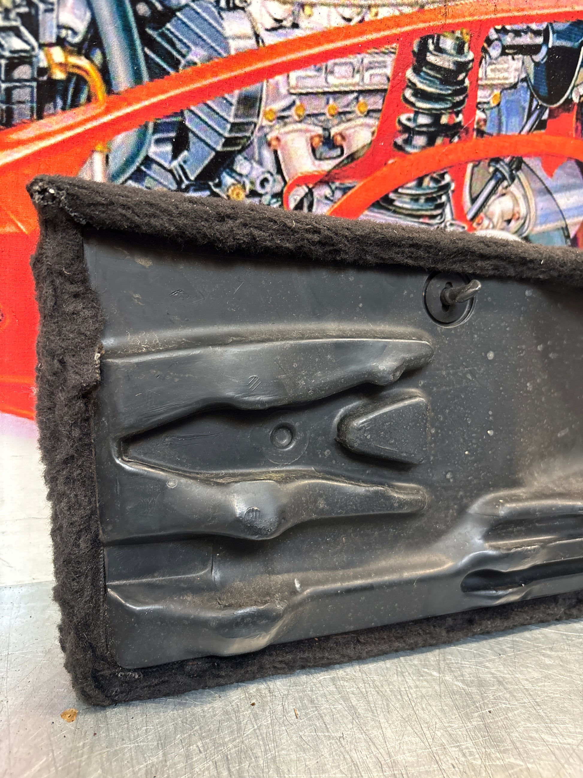 Porsche 928 greyish blue carpeted Tool kit panel cover, used 92855118106